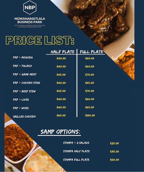 Grilled steaks, chicken, or lamb served with sides like pap, rice, or chips. Fresh salads or wraps with various fillings. Hearty dish of beef and chicken stew